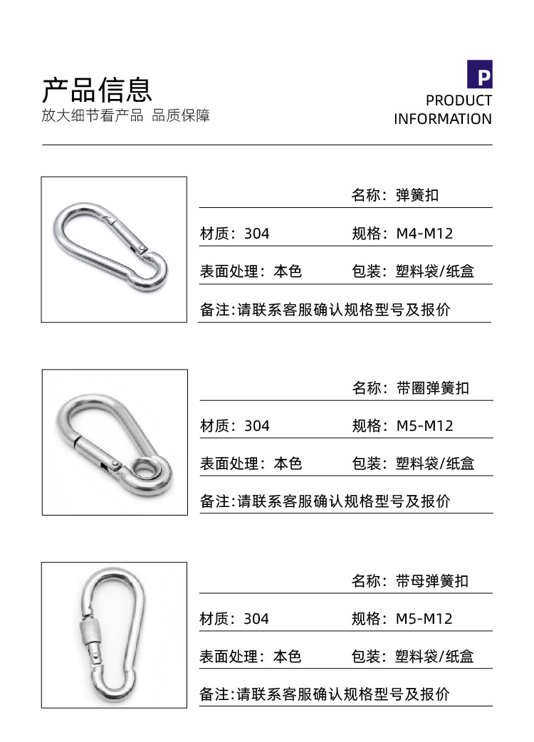 304不锈钢弹簧扣登山安全扣链条宠物扣带母连接扣带圈弹簧保险扣